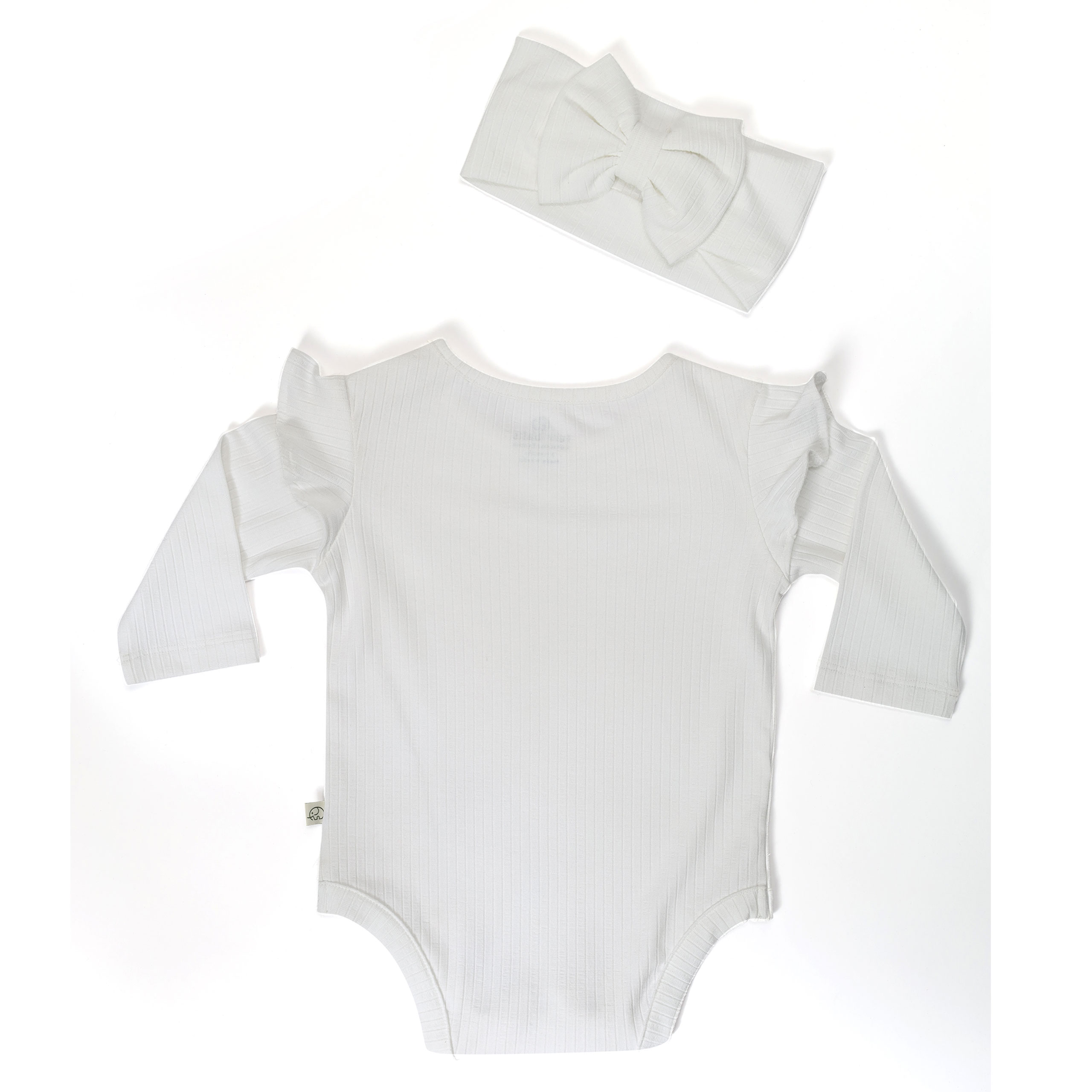 Lovingly crafted with care in 100% GOTS Certified Organic Cotton, which blends the luscious softness of cotton with thoughtful designs. A charming romper with ruffled full sleeves and an adorable bow headband that helps you step up the dressing game strong with your little ones!