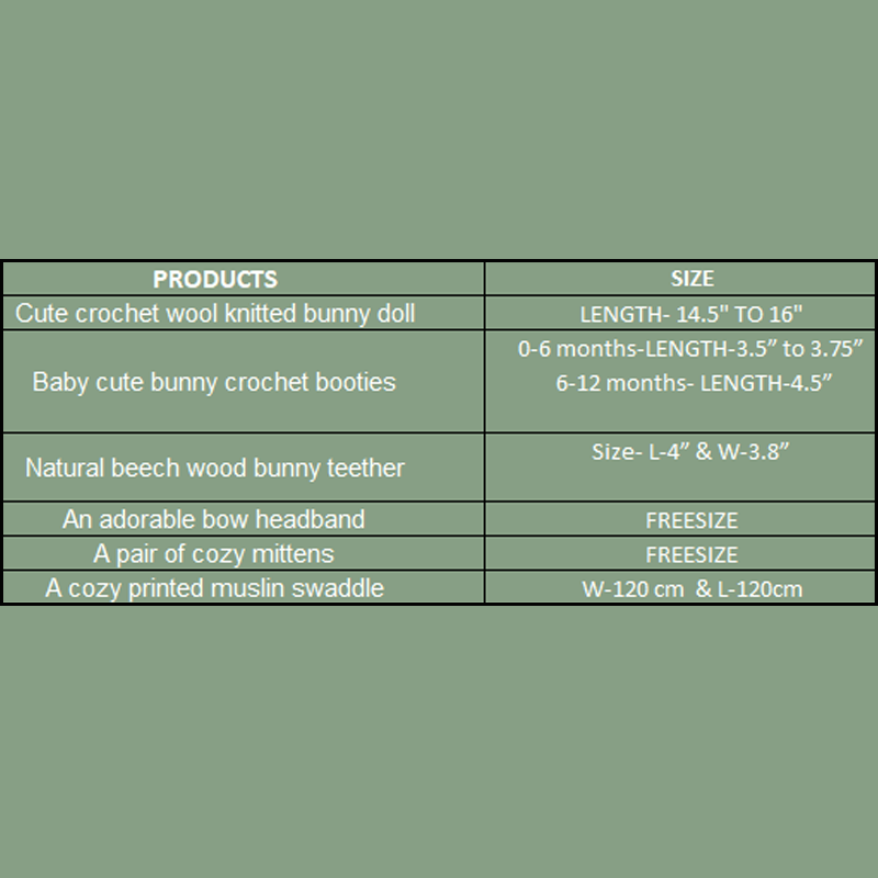 Each Box Includes | Cute crochet wool knitted bunny doll, Baby “loved” short sleeves bodysuit, Baby cute bunny crochet booties, Natural beech wood bunny teether, An adorable bow headband, A pair of cozy mittens, A cozy printed muslin swaddle |